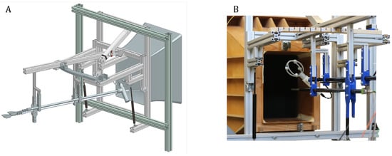 Depiction of the wind-tunnel test rig. (A) Illustration of the CAD model []; (B) installation positions of both probes.