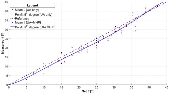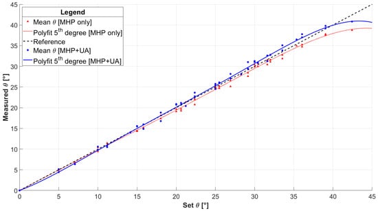 The comparison of the results from the MHP measurement data is shown in Figure 17. The straight measurement line represents the set angles. The mean values of the measured angles are displayed by single data points. Red points indicate data measured with only the MHP being mounted to the test rig; blue points show data measured by the MHP with both probes positioned next to each other. The respective curves were created using fifth degree polynomial curve fitting to the measurement points.