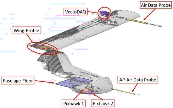 The main purpose of the e-Genius-Mod is to serve as a technology test bed in order to demonstrate new aircraft designs and technologies during free-flight conditions []. Following the approach used during NACRE (“New Aircraft Concept Research”), the e-Genius-Mod features a modular airframe, making both time- and cost-effective changes. Being equipped with a wide array of measurement equipment, the e-Genius-Mod serves as a so-called ‘flying wind tunnel’, collecting the relevant data needed to evaluate the performance and effectiveness of new technologies (see Table 3) [].