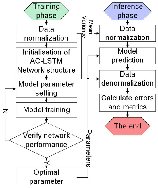 We implemented an AC-LSTM architecture for the network-prediction module. This hybrid model synergistically integrates convolutional neural networks (CNNs) and LSTM networks, leveraging the complementary strengths of both architectures. Specifically, the CNN component performs deep spatial feature extraction to capture trajectory motion patterns, whereas the LSTM module subsequently conducts temporal regression analysis on the processed sequential data. Compared with conventional LSTM implementations, our framework demonstrates a superior capability for modeling complex spatiotemporal relationships. To further enhance the representational power of the model, we incorporated an attention mechanism that dynamically prioritizes informative temporal states. The mathematical formulation of this architecture is described below.