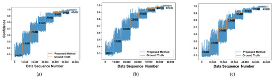 The Figure 5 demonstrates a comparison between the predicted and true confidence values in the network module. As shown, the predicted confidence varies inversely with data reliability and under low-SNR conditions, the confidence range expands significantly, indicating reduced reliability. Conversely, high-SNR scenarios yielded tightly clustered confidence values approaching 1.0, demonstrating consistency with statistical principles.