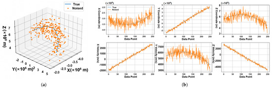 3D trajectory and its decomposition diagram. (a) The 3D trajectory of the minimum energy trajectory and the coordinate sampling point after adding noise. (b) The components of the trajectory in the direction and velocity (ECEF coordinate system) and their noise sampling points.