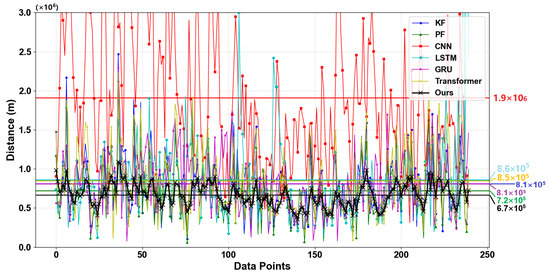 The figure above illustrates the prediction error fluctuations of the proposed algorithm and comparison algorithms on the test data. The x-axis corresponds to the trajectory sampling points, and the y-axis quantifies the discrepancy between the predicted and true values. The colored markers along the y-axis display the overall mean errors for each of the seven algorithms.