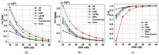 To rigorously assess the noise robustness of the algorithm, we conducted comprehensive trajectory prediction experiments employing varying noise-corrupted datasets (10–40 dB SNR). The quantitative evaluation employed three complementary metrics: the MAE, root mean squared error (RMSE), and coefficient of determination (), systematically measuring precision loss, error magnitude, and model interpretability across signal degradation conditions. The experimental results are shown in Figure 8.