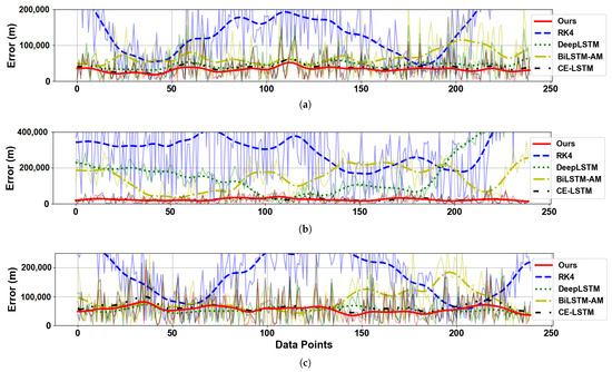 As shown in Figure 9 and Table 5, the proposed method demonstrates superior performance across all three spatial dimensions compared to the classical RK4 and several deep learning baselines (CE-LSTM, BiLSTM-AM, and Deep LSTM). Notably, in the Y-axis direction, which corresponds to the linear component of the trajectory, our method achieves a substantial performance advantage. Specifically, it records the lowest MAE (24,135 m), RMSE (30,813 m), and MAPE (0.93%) among all methods, indicating highly accurate and stable predictions. This significant improvement is attributed to the proposed model’s strong capability in capturing linear motion trends and effectively leveraging the temporal dependencies of the data.
