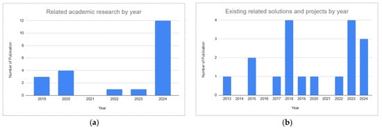 (a) Number of related academic research by year. (b) Number of existing related solutions and projects by year.