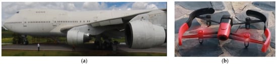 (a) An image of the old Boeing 747 parked in the airplane park near Suranaree University of Technology (SUT), Thailand, used in this study. (b) An image of the Parrot Bebop 1 drone employed in this study to capture the video footage of the old Boeing 747.
