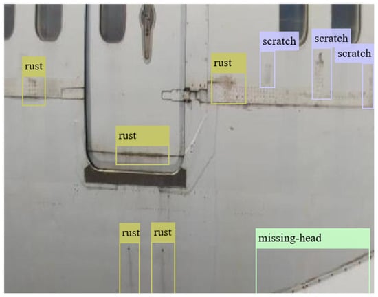 Commercial airplanes undergo regular inspections and maintenance checks to meet operational safety standards and regulatory requirements before flying. During general visual inspection (GVI) tasks, maintenance, repair, and overhaul (MRO) operators carefully examine airplanes for defects that could compromise safety and performance [1,2]. These inspections focus on critical aircraft components, including the fuselage, structural elements, landing gear, tires, and control surfaces. Identifying defects in the aircraft’s exterior (or skin), such as cracks, corrosion, dents, or missing heads (or missing rivets), is particularly relevant for maintaining aircraft’s structural integrity, preventing further deterioration, and mitigating risks to underlying systems.