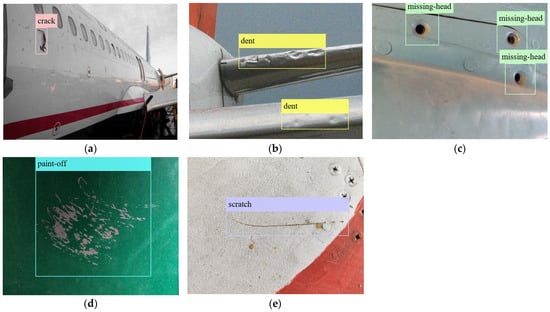 In addition to the dataset described above, we also chose to use a publicly available dataset provided by [19] in our study to further verify the models. We refer to this additional dataset as Dataset II in this paper. The dataset consists of 9651 training, 642 validation, and 429 test images of multiple defective airplanes. The defects in the images are annotated and classified into one of the five defect categories: (1) crack, (2) dent, (3) missing head, (4) paint-off, and (5) scratch. Examples of images for these five defect types in Dataset II can be seen in Figure 4.