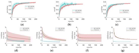 Training progress comparison of RT-DETR and YOLOv9 models based on the validation (a) precision, (b) recall, and (c) mAP50, training (d) box and (e) class losses, and validation (f) box and (g) class losses. The solid lines are the average of multiple training instances from both models using both Datasets I and II, while the shaded areas indicate the one-standard deviation below and above the mean of the training instances.