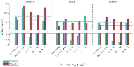 The performance results—including precision (P), recall (R), and mAP50—for the two models, RT-DETR and YOLOv9, are presented in Table 5 and Table 6 for Datasets I and II, respectively. These tables display results both before and after hyperparameter tuning, as described in Section 4.4. For the post-tuning results, we applied weight factors of to maintain a balance across accuracy metrics, with slightly more emphasis on recall (R) to minimize false negatives.