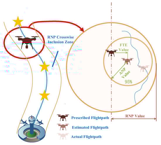 Therefore, logistics UAVs need to evaluate the real-time Actual Navigation Performance (ANP) of the navigation system and monitor its operational status. ANP is determined by the cross-track error and along-track error, which reflect the ANP of the system, as shown in Figure 1. It is defined as the probability circle radius (95%) of the estimated position uncertainty (EPU) of the navigation system [7]. The estimated position in Figure 1 is the estimated position from the navigation system, and the Flight Technical Error (FTE) is the error between the estimated position and the required position [8]. RNP is the minimum requirement for the accuracy of the navigation system in a specific airspace or route, which stipulates the standards of positioning accuracy, integrity, and continuity that an aircraft must meet during flight (for example, RNP 0.3 means that the lateral error does not exceed 0.3 nautical miles). ANP is the real-time performance index of the airborne navigation system, which is calculated by the accumulated errors of sensors (such as GNSS and INS). The core relationship between them is that ANP must always be less than or equal to RNP in order to meet the flight safety requirements. If ANP exceeds RNP (for example, due to signal interference or sensor failure), the crew should immediately take mitigation measures (such as switching navigation sources or changing routes). This dynamic comparison ensures the real-time monitoring of navigation performance and is the key foundation of PBN (performance-based navigation) operation.