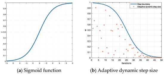 where M represents the maximum iteration number. denotes the domain of the sigmoid function, and generally, we adopt rand, where rand is a uniformly distributed random number. The design of adaptive dynamic step size is inspired by the sigmoid function, and the curve of its variation with the number of iterations is shown in Figure 4.