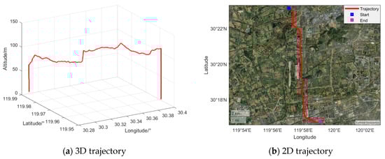 The experiments of rotorcraft logistics UAVs were conducted in Yuhang District, Hangzhou, Zhejiang Province, to evaluate the ANP. The operating temperature range was −5 °C~45 °C. Operating climatic conditions were moderate rain and wind force below level 5. UAV take-off weight and category were 15.5 kg, and III. Operation mode was over the horizon route flight. The inertial devices and GNSS parameters are in Table 2. A schematic diagram of the inertial devices and the rotorcraft logistics UAV is shown in Figure 5. The flight duration was 1120.7 s, with the flight trajectory illustrated in Figure 6.