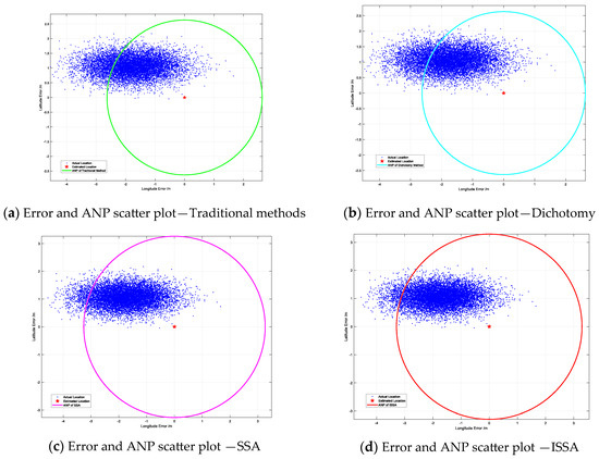 The specific meaning of the peripheral circle and the blue scatter in the figure can be combined with the coverage area of the green part and the orange part in Figure 3. When the coverage area between the peripheral circle and the blue scatter is closer to 95%, it shows that the ANP estimates better. As shown in Figure 10, the probabilities of the UAV’s actual position falling within the error circle are, respectively, 76.35%, 76.33%, 93.52%, and 94.99%, with the ANP values obtained by traditional methods, the dichotomy, SSA, and ISSA. Only our proposed ISSA method estimated an ANP value that meets the error probability requirements. It sufficiently verifies that the method proposed in this paper is efficient and highly accurate, effectively assessing the navigation system’s performance and enabling onboard performance monitoring and alerts.
