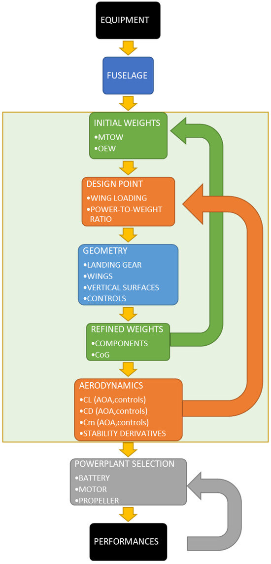 Finally, once both loops have converged, it will be necessary to select the propulsion system, i.e., the battery, speed controller, motor, and propeller combination that allows the design mission to be carried out. Again, this process is iterative or trial and error until the combination that best meets the performance requirements is found. Figure 1 shows this process described previously.