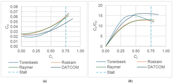 The aerodynamics of the UAS were determined using several different methods: Torenbeek’s method [21], Roskam’s method [22,23,25,26,27,28,36], Raymer’s method [30], and DATCOM [37]. All of these methods are classical procedures for estimating the aerodynamics of a commercial transport aircraft. The first three methods were appropriately modified to adapt them to small unmanned aerial vehicles, eliminating terms such as wave drag and adjusting the friction coefficients to the Reynolds number of the aircraft. The DATCOM method is a software product developed by McDonnell Douglas for the USAF; as such, it was not possible to adapt it to small UASs. Nevertheless, it was used for validation and comparison with the methods previously implemented. As shown in Figure 4, the DATCOM method is the most optimistic of all, as it predicts the best drag polar curve and the highest maximum aerodynamic efficiency. Torenbeek’s method is reasonably similar to DATCOM with respect to lift coefficients below 0.5. In contrast, Roskam’s and Raymer’s methods are very similar to each other and predict the poorest drag polar curve and aerodynamic efficiency. Therefore, the results from Roskam’s method were used for the subsequent iterations in order to be conservative in the estimation of the drag polar curve and aerodynamic efficiency (Figure 4). Furthermore, Roskam’s method for determining drag polar was validated under several flight conditions for regional jets, even takeoff conditions with the landing gear extended, which could be the configuration and flight speed most similar to those for this UAS [38]. Under this condition, the differences in terms of aerodynamic coefficients, particularly the polar drag, between Roskam’s method and flight tests are around 7%.