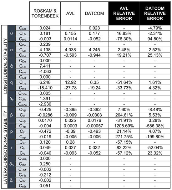 The stability derivatives presented in Figure 5 were calculated using different methods. Roskam’s procedure is very similar to DATCOM; however, there are differences in the coefficients related to the rolling and yawing rates. In addition, DATCOM only admits NACA aerodynamic profiles, and Libis has a Clark-Y B profile. Due to this, the relative error between Roskam and DATCOM in certain longitudinal moments and rolling and yawing derivatives is higher [21,28,39]. As an additional evaluation, we estimated all these stability derivatives by means of AVL (Athena Vortex Lattice) software, version 3.35 for Windows. Developed at the Massachusetts Institute of Technology by Mark Drela, AVL is a program that allows one to perform aerodynamic and flight dynamic analyses of rigid aircraft with arbitrary configurations [40].