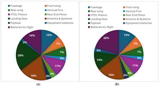 Figure 6. Weight distributions for both missions: (a) PL = 5 kg and R = 60 km, and (b) PL = 3 kg and R = 100 km.