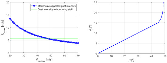 In Figure 9, the maximum supported gust intensity is shown on the left-hand side. This vertical speed induces an angle of attack and an increase in the load on the wings. The blue line is the maximum gust intensity that satisfies the load factor of 3.8 established by regulations for symmetric maneuvering conditions. The horizontal green line is the gust intensity that induces a stall angle of attack in the front wing at the chosen cruise speed. For this last calculation, a simple model considering that all wings experience the same vertical gust speed was used. On the right-hand side of the same figure, the rudder deflection required to negate the yawing moment in the presence of a crosswind is illustrated.