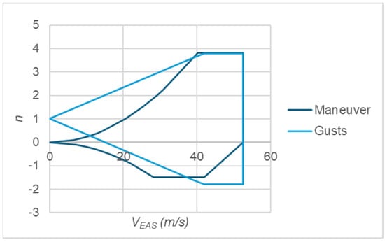 The flight envelope obtained is based on military regulations [31] because there are no civil requirements applicable to this aircraft that specify the constraints for the flight envelope. Figure 10 shows the results based on the application of this regulation to maneuvering envelopes without flaps, and gust envelopes. These two graphs indicate boundaries the aircraft should not cross during flight, and the structure must bear all the loads transmitted to the aircraft at whichever point in the diagrams, with the contours being the operational structural limits of the aircraft.