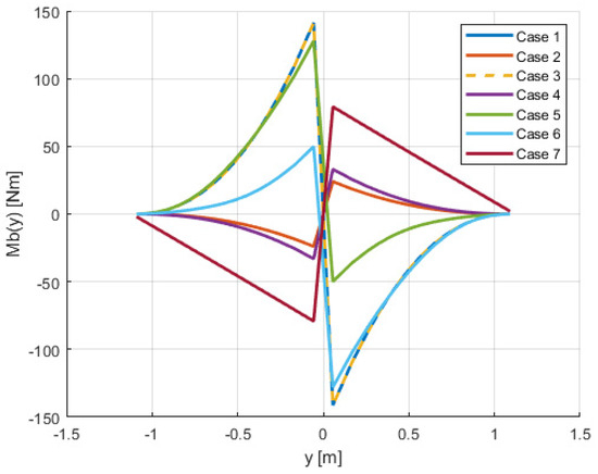 Figure 11. Bending moment introduced for the front wing for the seven load cases considered.