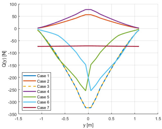 Figure 12. Shear force introduced for the front wing for the seven load cases considered.