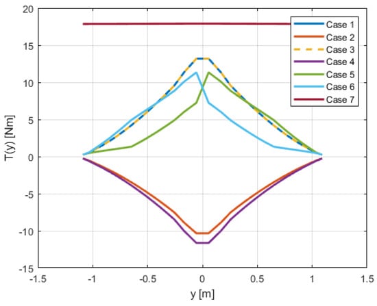 All these load cases were simulated with the aid of Tornado software, version 135 [44], excluding the seventh case, which can be calculated analytically. In both flight modes, the structural weight of the wing itself alleviates the loads to be borne because its contribution opposes the aerodynamic and thrust contributions. The drawback is that the structure has not been designed yet, so some hypotheses must be made in order to account for this contribution. As a first approximation, by means of a second-class method, the wing weight was predicted [30], with the result being approximately 900 g. Thus, it was supposed that this weight is distributed along the wingspan as a function of the chord to the power of 1.2. This hypothesis should be evaluated once the structure has been manufactured. Figure 11, Figure 12 and Figure 13 illustrate the bending moment, shear force, and torsion moment, respectively, for all the load cases considered.