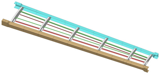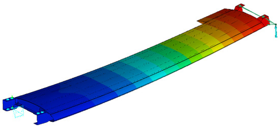 Figure 16. Displacement field of the structure in the analyzed load case. Maximum (red) = 27 mm; minimum (blue) = 0 mm.
