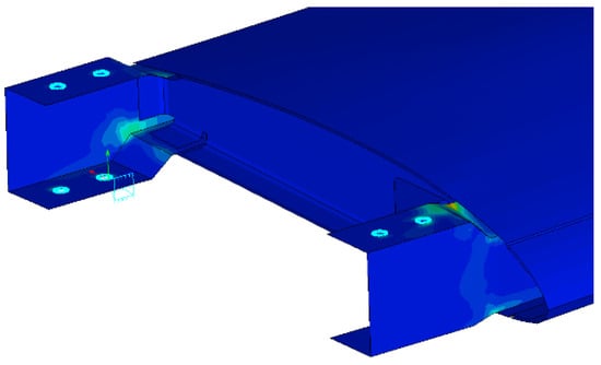 Figure 17. Details of the failure index of the material in the area of the root joint bolts (higher values). Maximum (red) = 0.273; minimum (blue) = 4 × 10−4.