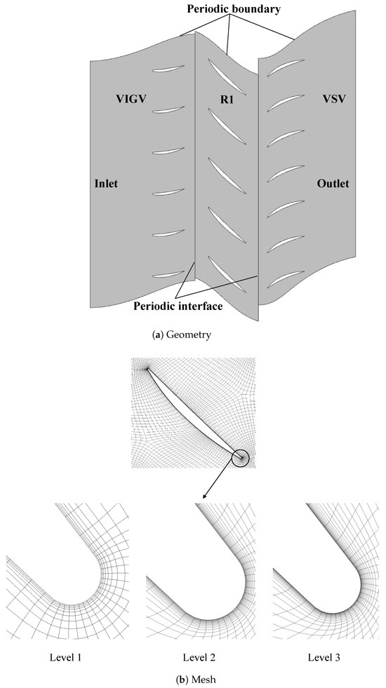 Gas turbines operate based on the Brayton cycle, where axial compressors play a critical role in pressurizing the incoming air prior to combustion, as their performance directly impacts the efficiency, stability, and reliability of the entire engine system [1]. The growing demand for aero-engines with higher pressure ratios, increased speeds, and improved efficiency has driven the evolution of compressor design, resulting in more complex geometries. This evolution includes higher inlet flow speeds, increased tip speeds, progressively greater stage loads, and more compact designs. However, these advancements also intensify the transient effects between the rotor and stator [2]. Rotor–stator interaction [3], characterized by the periodic unsteady flow induced by the wake of the upstream blade row and the potential flow of the downstream blade row, is the primary cause of forced blade vibrations. In practice, high-cycle fatigue failure of blades caused by RSI vibration has become a key issue affecting the structural integrity and reliability of engines during their operational life cycle. Analyzing the unsteady excitation caused by RSI is essential for the design and optimization of compressors.