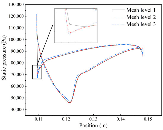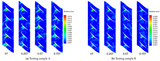 The MPR-ROM method is used to solve the flow field of test sample B, and the relative errors between MPR-ROM and CFD results are calculated for both samples A and B. Figure 21a shows the relative error distribution for sample A, while Figure 21b shows that for sample B. The maximum relative error near the typical operating point in sample A is 1.4%, whereas near the choke boundary in sample B, it reaches 2.9%, indicating lower prediction accuracy near the choke boundary. Errors are primarily concentrated near the leading edge and the mid-section of the suction side, consistent with pressure fluctuation modes caused by shock waves and flow separation. The leading-edge pressure gradient is high due to shock waves, making predictions more challenging. The lower accuracy in the mid-section of the suction side is due to the significance of the pressure fluctuation gradient, and the low-pressure region amplifies relative errors. The modal analysis under different outlet pressures in Section 4.1 showed that shock waves and flow separation are highly sensitive to outlet pressure near the choke boundary, explaining the lower prediction accuracy near the choke boundary.
