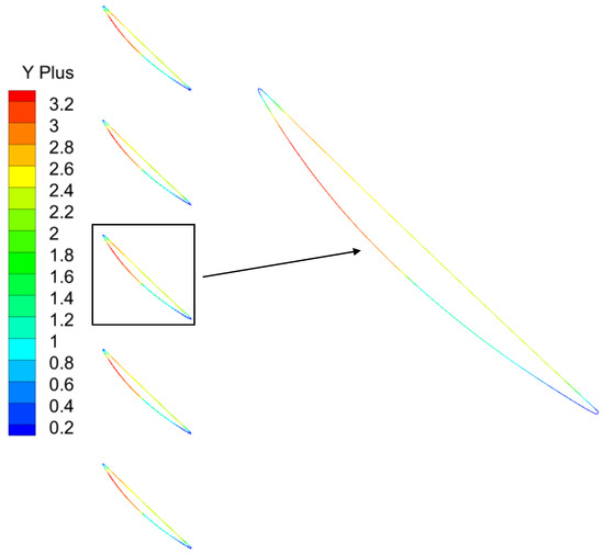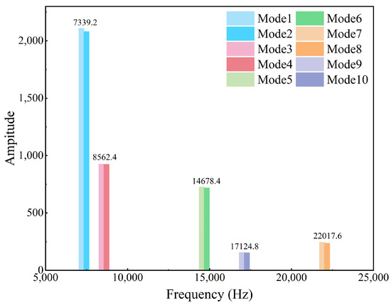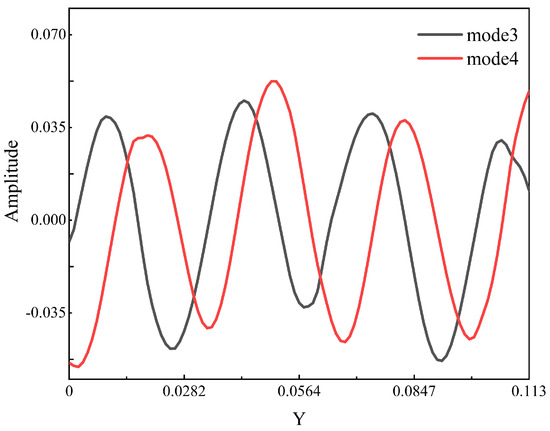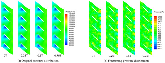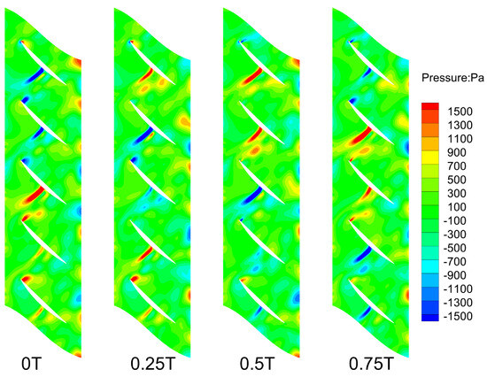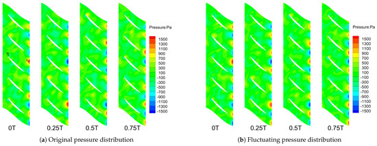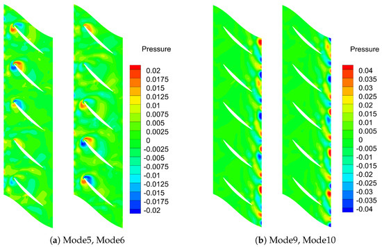 Figure 15 shows the fluctuating pressure distribution of the flow field at an outlet pressure of 105 kPa, a condition close to the choke boundary. Compared to the mean-removed pressure distribution under the commonly used operating condition shown in Figure 6b, the pressure fluctuations near the leading edge and the mid-section of the suction side are more intense. By extracting various flow characteristic modes through the POD method, this change can be observed more intuitively, providing a convenient method for vibration analysis and optimization under fluid–structure interaction in compressors.