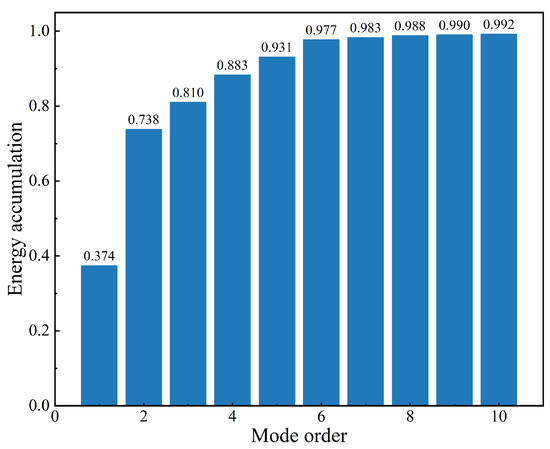 The eigenvalue represents the contribution of the corresponding spatial mode to the original flow field. The sum of the eigenvalues represents the total energy of the flow field [37]. The larger the eigenvalue, the more prominent the corresponding spatial mode is in the original flow field. This leads to the concept of mode energy proportion to evaluate the impact of truncating spatial modes on the original flow field as