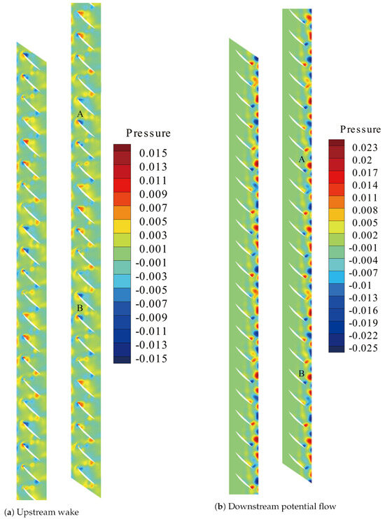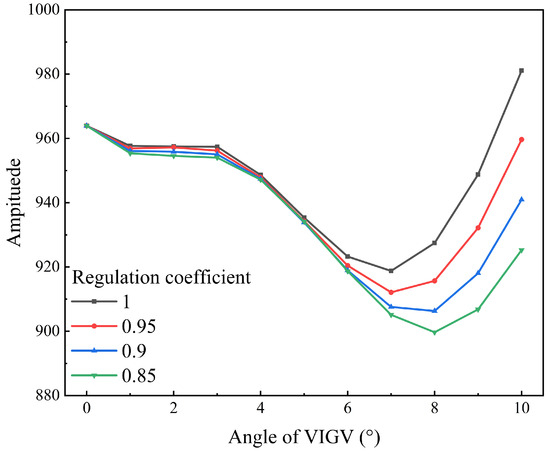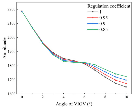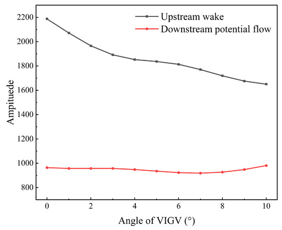 In compressor stator regulation, the adjustment mode typically involves the coordinated control of multiple stages of stator vanes. Here, the established ROM is utilized to rapidly obtain the unsteady flow field of RSI in the compressor cascade, analyzing the influence of angle adjustment on the excitation characteristics. Figure 22 illustrates the variation in excitation amplitude of upstream wake and downstream potential flow with angle when the regulation coefficient is 1 (where the angle ratio between VSV and VIGV is 1). It can be observed that the variation amplitude of the upstream wake is significantly higher than that of the downstream potential flow. The excitation amplitude of the upstream wake gradually decreases as the angle increases, showing a more pronounced change at smaller angles (0° to 4°), a relatively smoother variation between 4° and 6°, and a slight increase in the amplitude of change beyond 6°. In contrast, the excitation amplitude of the downstream potential flow initially decreases and then increases with the angle, exhibiting a turning point in its trend at 7°.