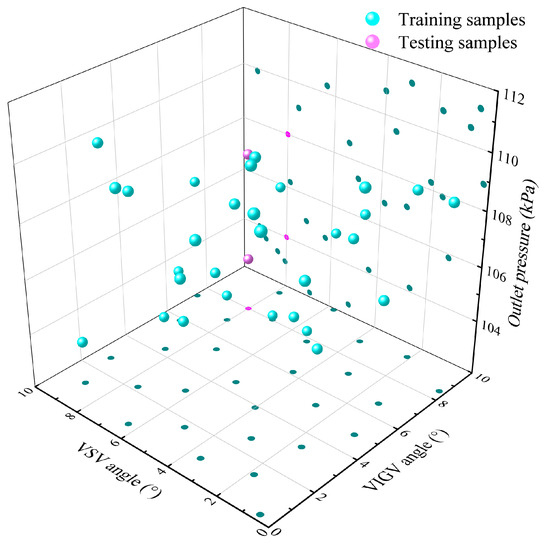 Using the 1.5-stage compressor model introduced in the previous section, the VIGV and VSV angles are constrained within the range of 0° to 10°. Thirty training samples are generated for these two parameters using the LHS method. For each sample, the outlet pressure at the choke boundary and surge boundary is determined, which is then used as the boundary condition for sampling the outlet pressure parameter of each training sample. Additionally, two test samples are selected from the parameter space. Test sample A has a VIGV angle of 8°, a VSV angle of 8°, and an outlet pressure of 108 kPa, while test sample B has a VIGV angle of 8°, a VSV angle of 8°, and an outlet pressure of 104 kPa. Sample A represents a typical operating condition, whereas sample B is a condition near the compressor choke boundary. The distribution of the samples in the parameter space is shown in Figure 16.