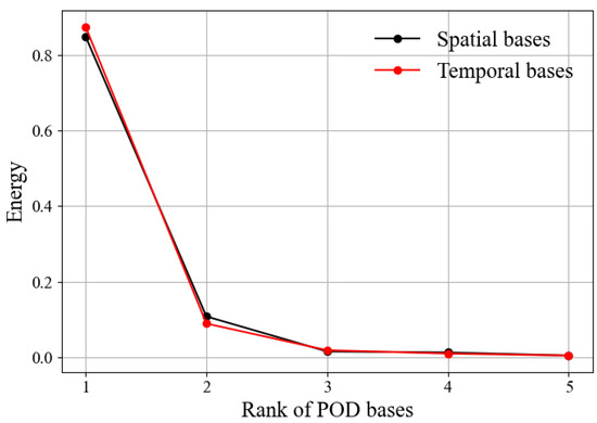 Figure 17 shows the energy proportion of the first five spatial and temporal bases. The first few bases capture most of the energy, especially the first-order basis, with 84% and 87.5% energy proportions, respectively. This indicates that a small number of bases can effectively reconstruct and .