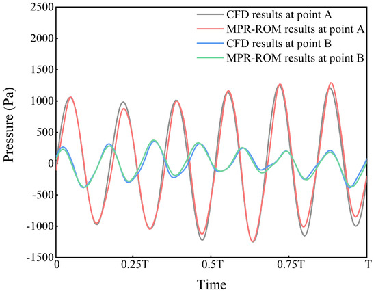 Comparison of results between CFD and MPR-ROM methods over one period at Points A and B.