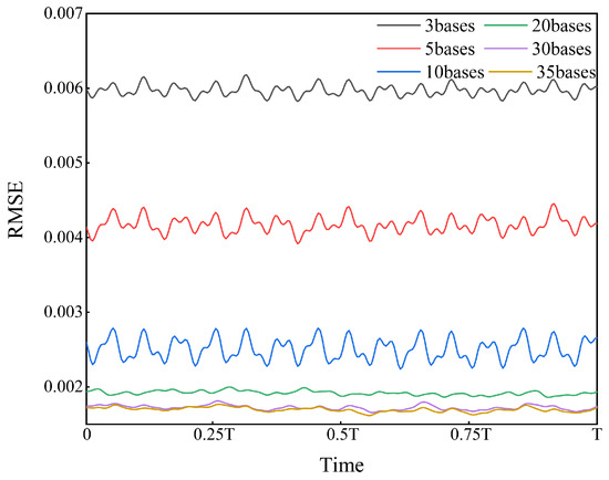where represents the number of mesh nodes in the rotor region, is the pressure at the i-th node at time t in the CFD results, is the pressure at the i-th node at time t in the MPR-ROM results, and represents the average relative error across all nodes in the rotor region at time t. Figure 20 shows a variation of the root-mean-squared relative error over one period under different numbers of spatial bases, and the results are consistent with those in Table 6. The error by retaining 30 spatial bases is nearly identical to that obtained by retaining 35 spatial bases, and further increasing the number of spatial bases no longer improves the prediction accuracy.