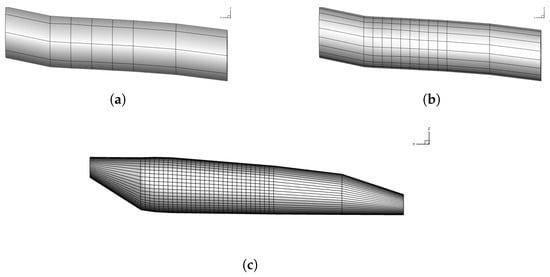 Fuselage FFD boxes with varying refinement levels (number of control points in the wing–fuselage intersection zone of interest). (a) Coarsest mesh (not used). (b) Medium mesh (used in strategy (1)). (c) Finest mesh (used in strategy (2)).