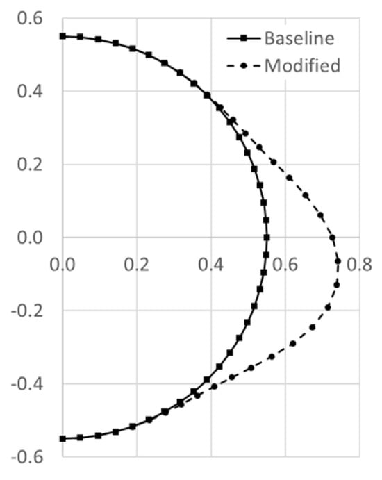 Using this strategy, different fuselage shape outlines can be obtained through the control of only n design variables, with n being the number of active FFD box cross-sections corresponding to the scaling factor . Examples of possible deformations can be seen in Figure 2c,d, where random parameters were used. The impact of the design parameter can be observed from these examples: low values have a less smooth approach but better local deformations (Figure 2c), while high values tend to smooth the fuselage shape with the setback of diminishing local changes (Figure 2d).