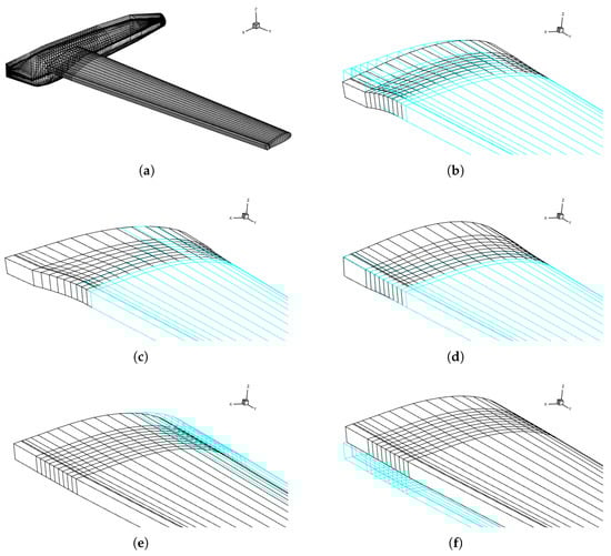 Wing FFD box (blue) with deformation strategies previewed (black). (a) Undeformed wing FFD box with refinement at intersection region. (b) Local twist deformation. (c) Local chord scaling. (d) Local thickness scaling. (e) Horizontal relative position. (f) Vertical relative position.