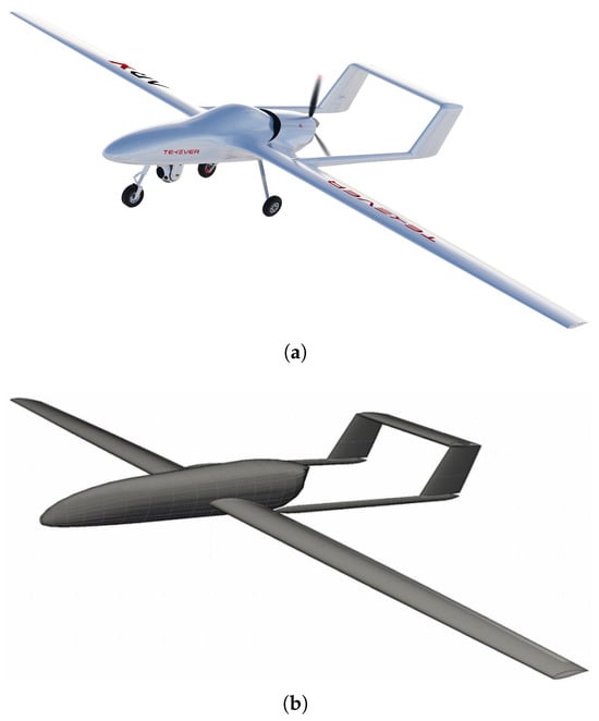 Test case UAV: Tekever ARX. (a) Current detailed design. (b) Simplified geometry for analysis.