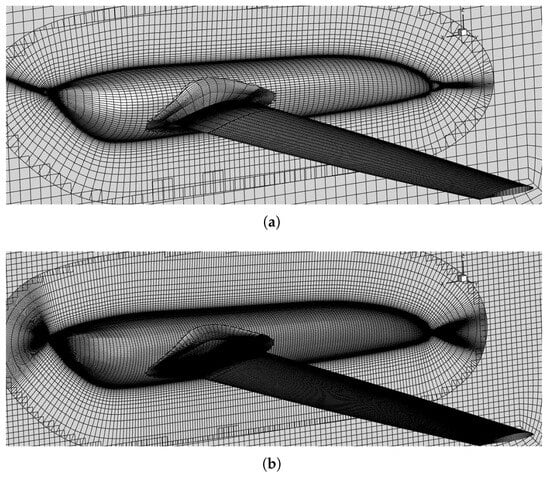 Each CFD mesh was generated using the overset technique with four initial structured meshes: wing mesh, fuselage mesh, collar mesh at the wing–fuselage intersection region, and background mesh. Both fuselage and wing meshes overlap each other, requiring the definition of their intersection through the usage of the collar mesh. The latter was generated through TekAero, where geometric intersection is carried out and automatic collar grid generation is conducted with both body and surface fitting. Figure 6 illustrates both the coarsest and finest mesh used in this study, where only the right half of the aircraft was modeled due to symmetry.