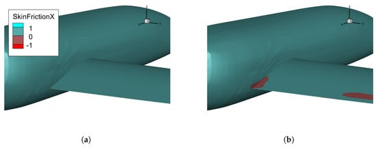 The development of stall with increasing AoA is mostly due to the growing separation occurring on the wing suction side (upper surface), but the secondary flows around the wing and fuselage intersection also play a role, as attested by Figure 9, where the surface skin friction sign in the longitudinal direction is displayed. The zero value represents the separation lines and negative values (in red) represent regions of reversed flow.