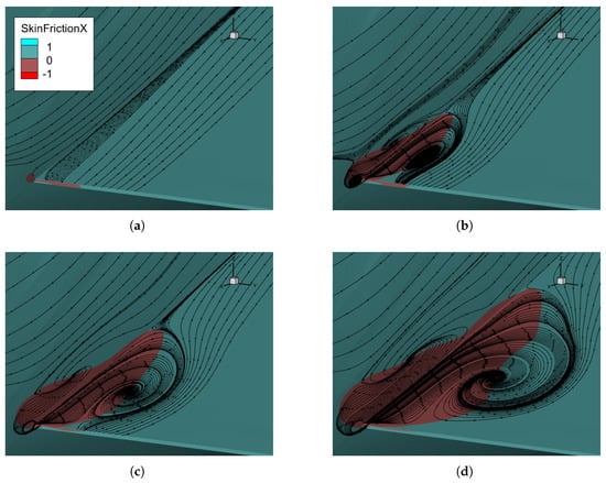 Skin friction sign on the longitudinal direction with overlaid streamlines: detail of secondary flow intensity growth with AoA. (a) Operating at °. (b) Operating at °. (c) Operating at °. (d) Operating at °.