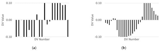 For both cases, the optimal solutions were limited by many DVs reaching their bounds, as seen in Figure 11, where each bar corresponds to the value of each design variable ordered along the longitudinal axis from leading to trailing edge. From the DV ordering, it can already be concluded that both solutions exhibit the same shape deformation pattern to reduce drag: the fuselage cross-section is decreased near the wing LE region and increased near the wing TE region. Although not intuitive, the benefit of increasing the cross-sectional radius at the TE region to reduce the wing–fuselage interference drag outweighs the drag penalty of increasing the frontal area. While better results could have been achieved with wider DV bounds, these imposed values corresponding to a relatively change of of the original fuselage radius were deemed reasonable to not significantly impact the UAV internal payload area. As a side benefit, those relatively strict bounds contributed to the successful mesh morphing during the optimization iterations.