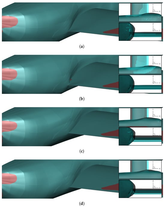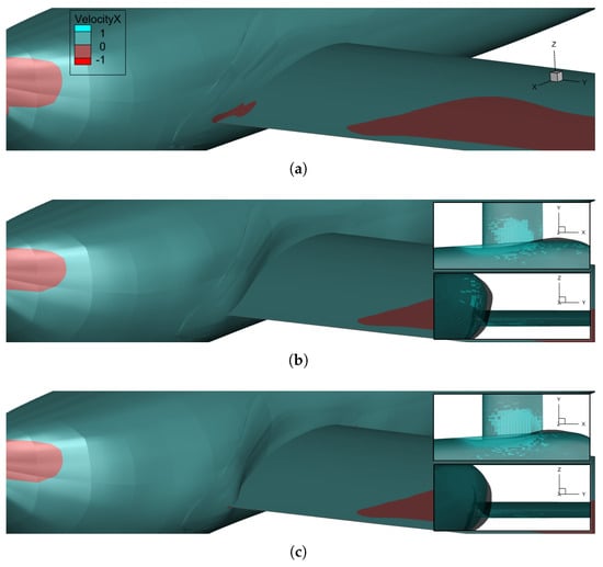 The initial shape shown in Figure 12a can be compared to the optimized wing shape near the fuselage connection for the different wing-only deformation strategies shown in Figure 13, where the inset figures contain the top and back view and compare the baseline shape (blue) to the optimized (black). In contrast to the fuselage-only optimization results seen in Figure 12, none of the skin friction contour plots show any clear reduction in the separation bubble in the connection region. In fact, both cases t and produced a slight increase. Thus, the drag reduction obtained is a consequence of either (i) a better placement of the wing within the fuselage cross-section or (ii) a better overall pressure distribution obtained through the usage of twist in the wing–fuselage intersection region.
