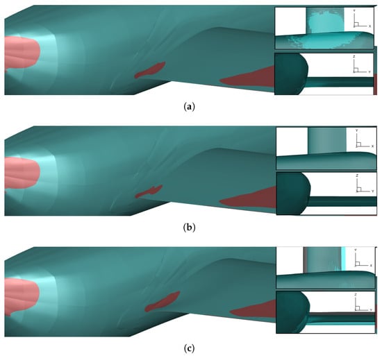 The resulting optimal shape can be seen in Figure 15, which is similar to the shape found for the single-operating-point case optimization (Figure 14a), with a reduction in cross-sectional area at the leading edge region and an increase near the trailing edge. Interestingly, the surfaces obtained are smoother than unconstrained single-operating-point optimizations. Again, the interference effect was mitigated and the flow separation eliminated at 6° AoA in the wing–fuselage trailing region.