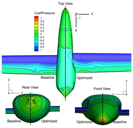 The comparison of the UAV complete fuselage and wing between the baseline design and the one with optimally shaped wing–fuselage interface for the multi-operating-point case can be observed in Figure 16. The contour of the pressure coefficient reveals that both distributions remain very similar, since the shape optimization was exclusively located at the wing–fuselage intersection region. But, as expected, there are some significant local differences, which were driven by those local fuselage and wing shape deformations. On the wing root upper surface, the pressure suction peak is less intense and occurs closer to the LE, making the pressure recovery more gradual and thus with a milder adverse pressure gradient, which corroborates the observation of the elimination of flow separation in that region. Also, the wing has moved upward and forward, which caused a change in the fuselage pressure towards the rear and, more significantly, on its side. This, compounded with the cross-section area variation along the fuselage near the wing position, resulted in a significant fuselage pressure increase near the wing LE and decrease near the wing TE regions.